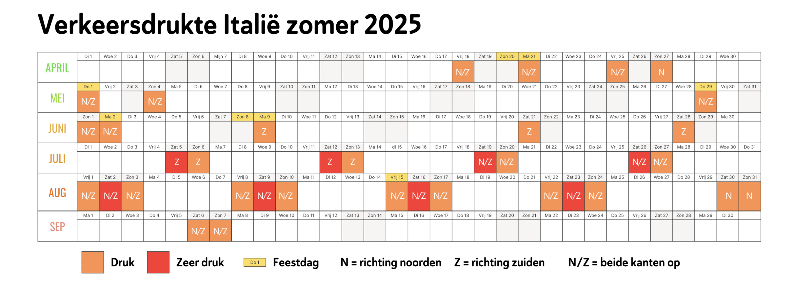 Officieel kent Italië geen Zwarte Zaterdagen, maar de praktijk spreekt boekdelen: de zaterdagen 2, 9 en 16 augustus 2025 zijn zeer druk. Ook de zondagen in juli en augustus zijn druk. Vrijdagen vallen relatief mee.