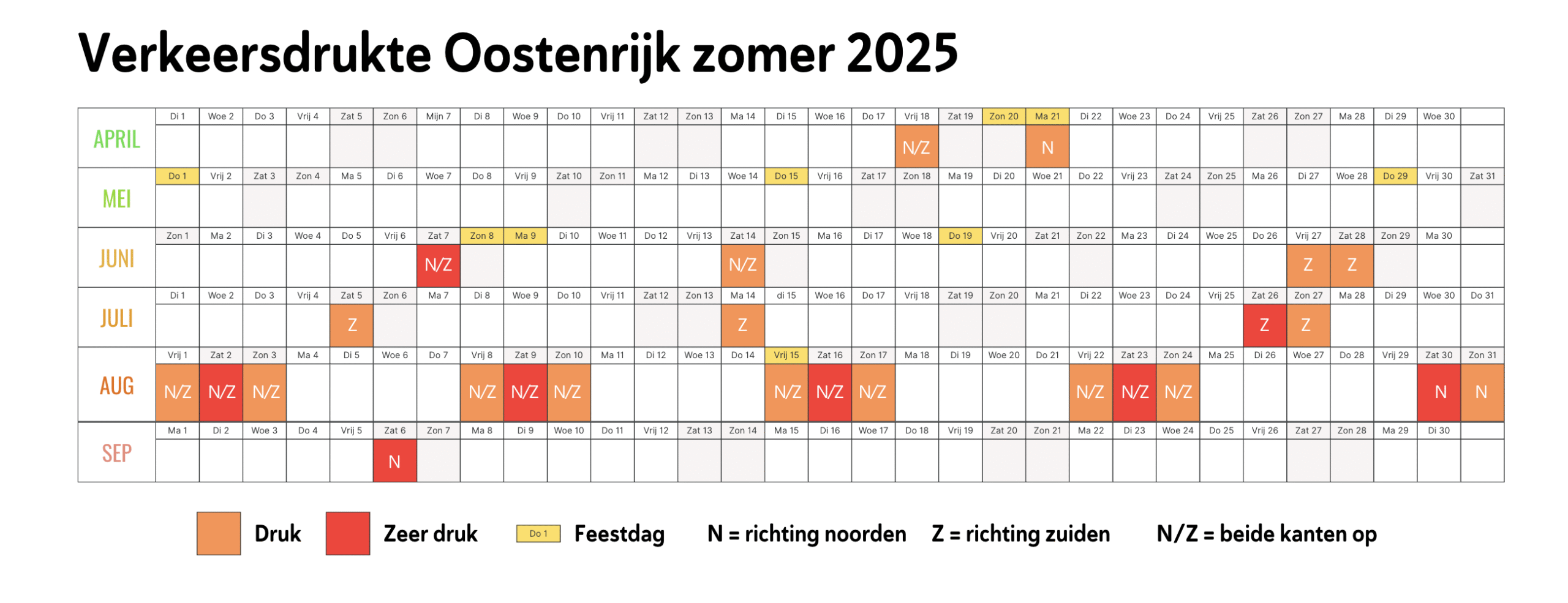 Oostenrijk is vooral een belangrijk transitland voor vakanties naar Slovenië, Kroatië en Albanië. De zwaarste verkeersdrukte wordt verwacht op zaterdagen 2, 9 en 16 augustus, met files in beide richtingen. Ook 6 september wordt naar verwachting zeer druk gemarkeerd door de terugkeer naar huis van veel reizigers.
