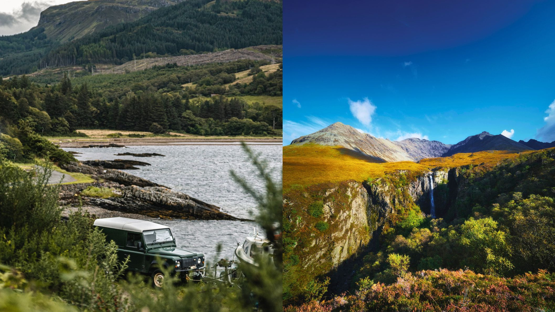Schotse Hooglanden tijdens een roadtrip met DFDS: een ruige kustlijn met een Land Rover bij het water en een bergachtig landschap met een waterval in de herfstkleuren. Foto: Unplash