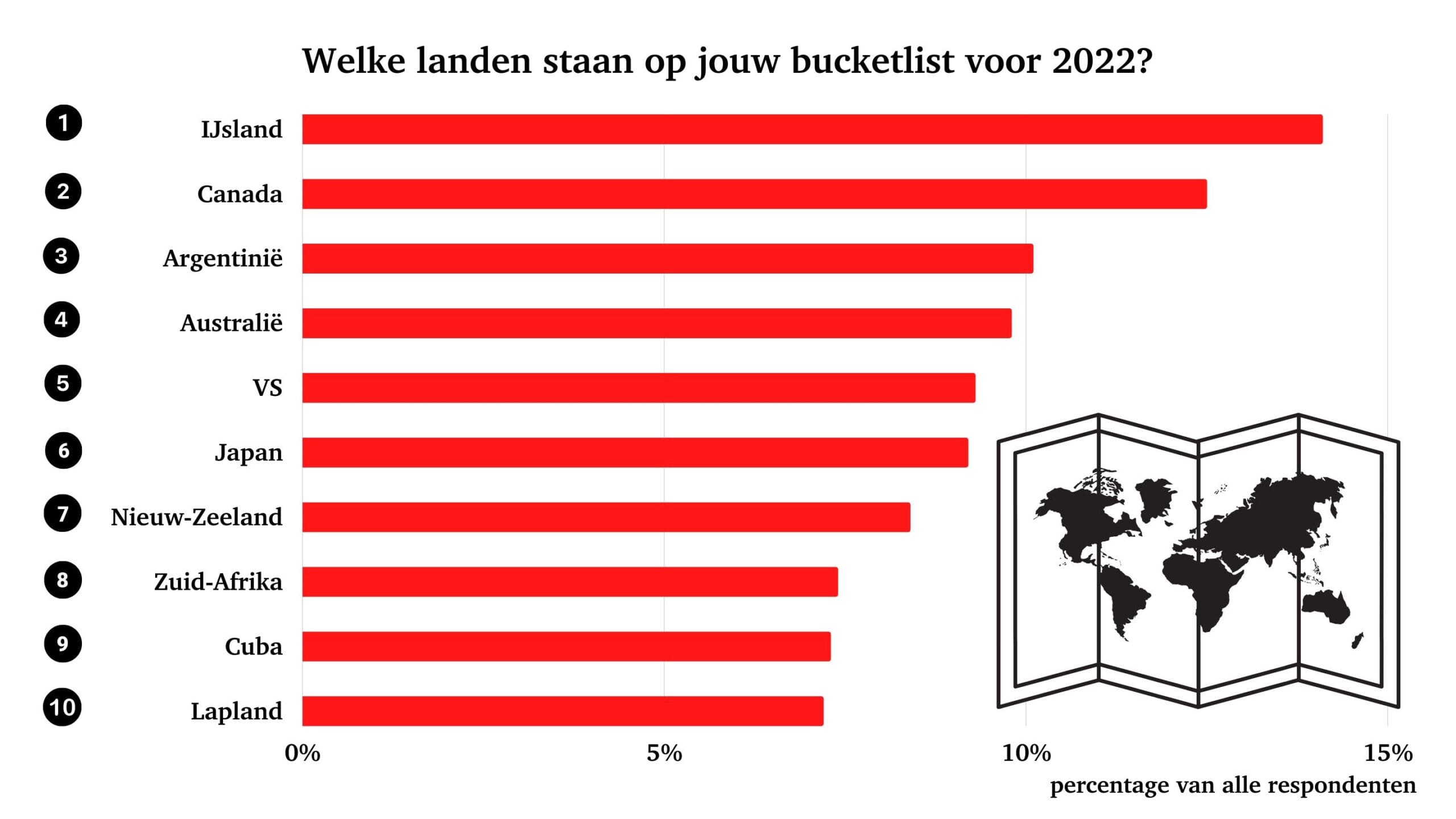 Meer dan vijfduizend Nederlandse reizigers vulden hun bucketlist in naar aanleiding van een oproep van Columbus Travel en de vooraanstaande Nederlandse reisorganisatie Riksja Travel. Op de vraag welke landen op de bucketlist voor 2022 staan, antwoordde maar liefst 14% van alle respondenten graag naar IJsland te willen afreizen. Dit land prijkt hiermee bovenaan de bucketlist van de Nederlander, gevolgd door Canada, waar 12,5% van de reizigers graag dit jaar naartoe zou willen gaan, en Argentinië en Australië, waar één op de tien Nederlanders graag vakantie zou willen vieren. Uit de survey blijkt verder dat de natuur de belangrijkste motivatie is om naar deze bestemmingen af te reizen.