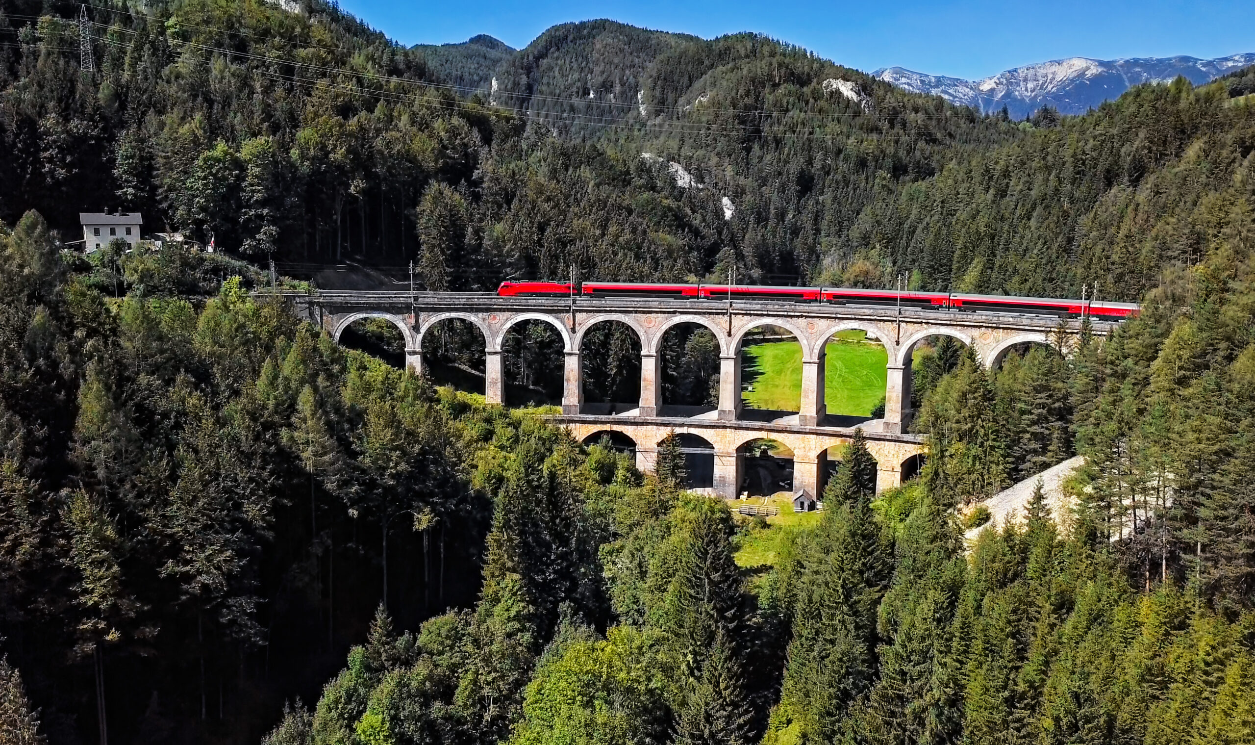 Tussen 1848 en 1854 werd de Semmeringspoorlijn in Oostenrijk aangelegd van Gloggnitz naar Mürzzuschlag. Dit 41 kilometer lange traject door de bergen is een van de grootste staaltjes civiele techniek van de spoorwegbouw. Zo‘n 10.000 arbeiders bouwden in totaal veertien tunnels, zestien lagere viaducten en iets meer dan honderd viaducten waarmee een hoogteverschil van 450 meter werd overbrugd. In een tijd zonder drilmachines om tunnels te graven, was dit een ongekende prestatie. De kwaliteit van de tunnels, bruggen en viaducten is zo goed dat de lijn tot op de dag van vandaag continu in gebruik is. De lijn loopt door een spectaculair berglandschap dat lang in trek was onder de adel uit Wenen. Je vindt er nog steeds prachtige villa‘s en hotels uit die tijd langs het spoor. Maar ook hier gaan de treinen in het donker verdwijnen, want tunnelbouwers werken al sinds 2012 aan een dertien kilometer lange tunnel om de Semmeringlijn te ontlasten. Opening is gepland in 2030.