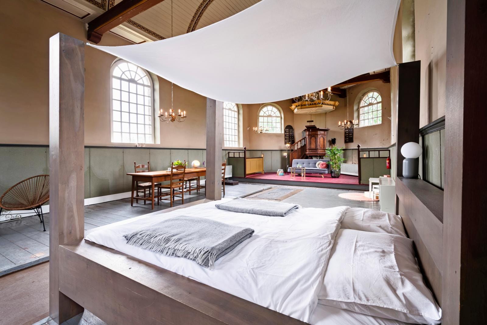 Sanne Kiel en Jennemie Stoelhorst zagen het licht! Om de iconische kerken die ons land rijk is te behouden en in gebruik te houden, bedacht het tweetal Heilige Nachten, een initiatief dat het mogelijk maakt om de nacht door te brengen in historische kerken. Word bijvoorbeeld wakker onder een preekstoel in de dorpskerk van Oosterwolde of in een hemels hemelbed in het kerkje van Peperga (zie boven). Veertig procent van de inkomsten vloeit terug naar de eigenaren en kan dus worden aangewend voor het behoud, € 150 voor twee personen.