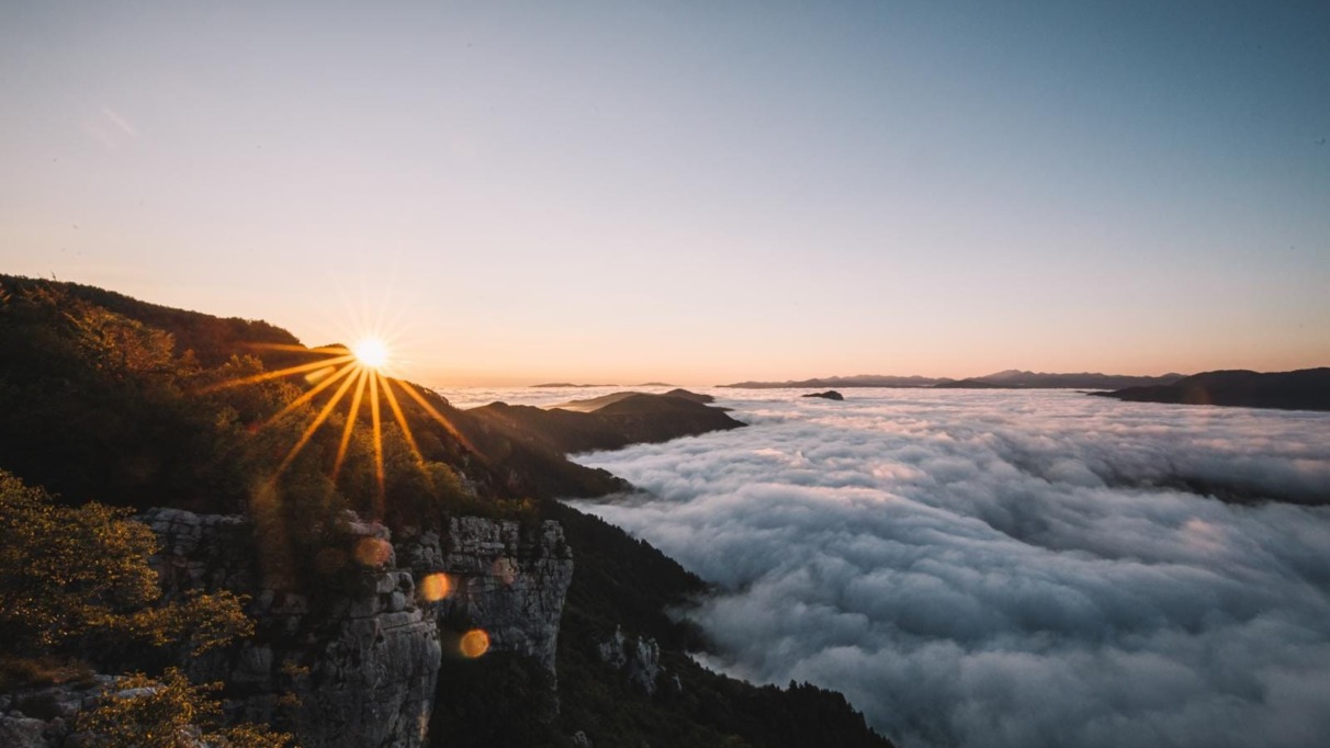 De wolken in het dal onder Firštov rep, ‘de staart van Firštov’, dat deel uitmaakt van de kalksteenrotsen van Loška stena aan de rand van het oerbos, met uitzicht op Kroatië.
