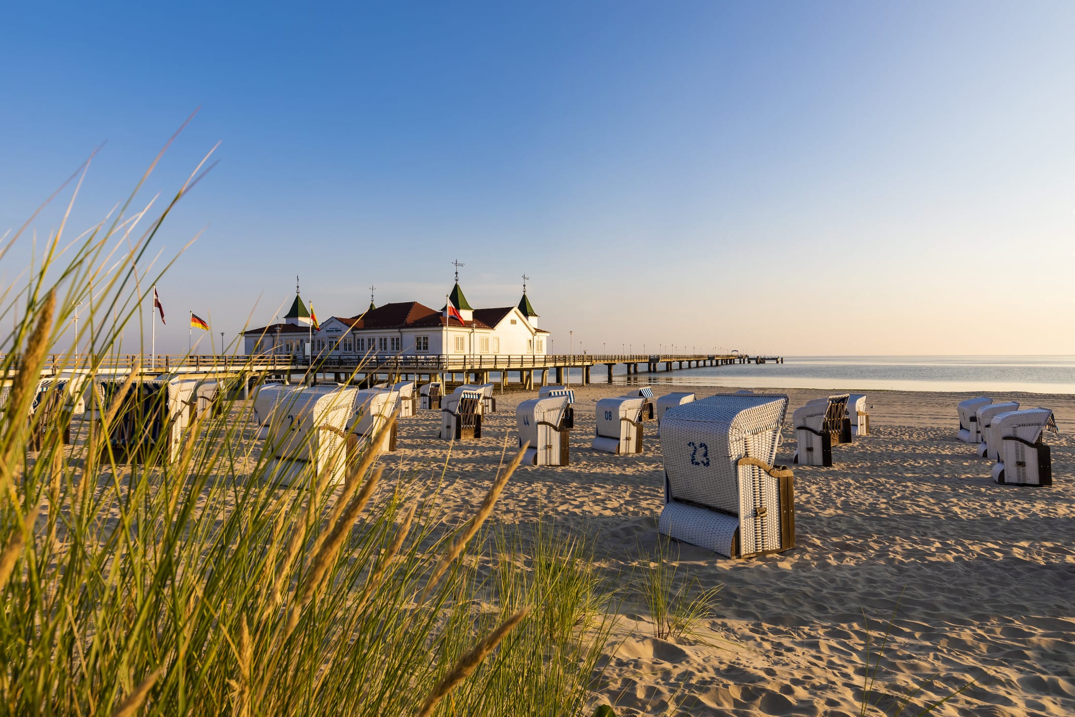 Duitsland heeft meer dan vijftig OstseeInsel, maar slechts zes ervan zijn bewoond. Usedom is het op één na grootste en wordt ook wel 'het strand van Berlijn' genoemd. De keizerlijke kuuroorden van Ahlbeck, Heringsdorf en Bansin waren ooit via een rechtstreekse trein verbonden met de Duitse hoofdstad. Tegenwoordig moet je in Züssow overstappen op het dieselboemeltje van de Usedomer Bäderbahn, die naar Świnoujście in Polen rijdt, de eindbestemming van de trein. Na Wolgast kruis je de Peenestrom over een knalblauwe ophaalbrug en volg je een prachtige route van zo’n anderhalf uur over het eiland. In de kustplaatsen herleven keizerlijke tijden, met aan de kust en in het centrum monumentale witte villa’s. Hier bracht de Berlijnse adel in de negentiende eeuw hun vakanties door. In Peenemünde, bereikbaar via een zijlijntje (overstap in Zinnowitz), zie je waar de nazi’s in 1942 voor het eerst een raket de ruimte in schoten.