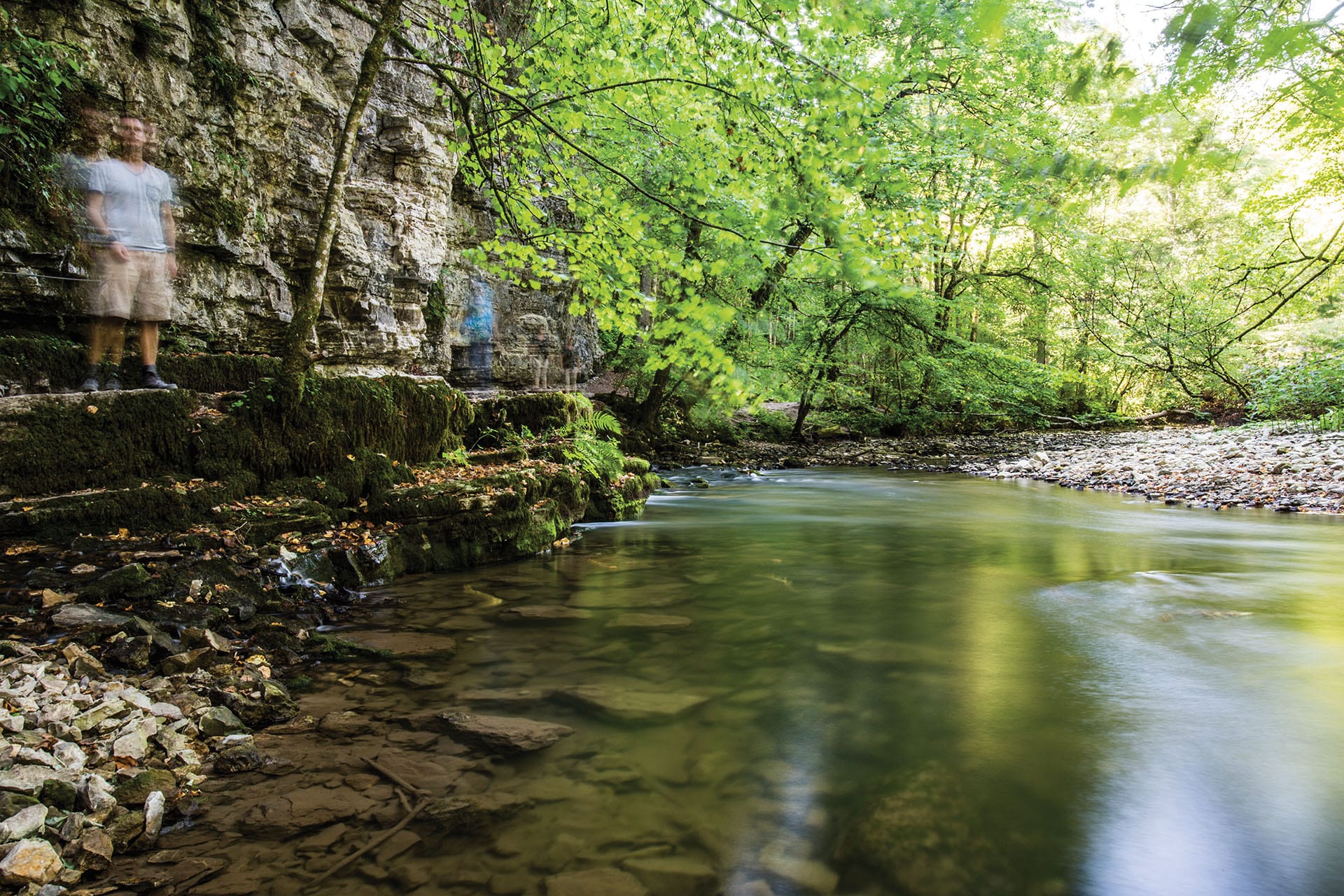 De rivier zinkt door de poreuze bodem heen en het geraas van het water verstomt, een piepklein beekje achterlatend. Zo’n twee kilometer verderop stroomt het water vanuit de bergwand weer de rivierbedding in. Als je langs de grote kalksteenformaties naar boven kijkt, zie je hoe diep de kloof is. Tot ver boven je zie je de dikke vegetatie tegen de steile helling.