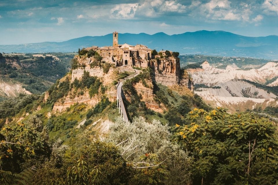 Het middeleeuwse Civita di Bagnoregio is maar op één manier toegankelijk: over een spectaculaire, driehonderd meter lange loopbrug. Door erosie verzakt het tufsteen en is het een kwestie van tijd voordat het middeleeuwse dorp met de grond gelijk wordt gemaakt. De weinige bewoners die het aandurven te blijven, fleuren hun huizen graag op met bloemen — een surrealistisch gezicht.