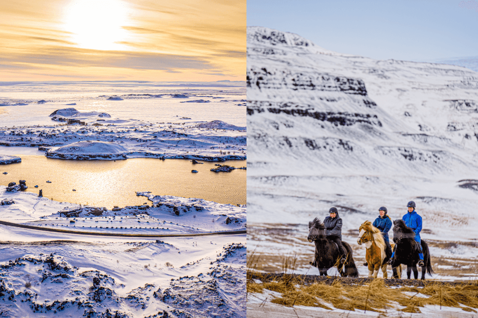 Voor echte buitenaardse taferelen reis je door naar Mývatn, een regio op anderhalf uur rijden van Akureyri. Via bergtunnels en kronkelende kustwegen bereik je het wonderbaarlijke maanlandschap. Pseudokraters, lavavelden, rookpluimen en gestolde magmarotsblokken verwelkomen je. Hier scheur je in een Super Jeep of op een sneeuwscooter langs aardkloven en ravijnen en beklim je op spikes eeuwenoude kraters. Aan het einde van de dag proost je met een lokaal witbiertje tussen de locals in het turkooisblauwe Mývatn Nature Baths.